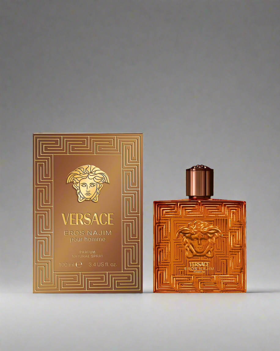 Versace Eros Najim begins with a vibrant burst of bright yellow mandarin, an explosion of notes that evokes the radiant colors of the desert sky before dawn. Saffron and cardamom combine to create the enveloping warmth of desert dunes, elegantly balanced by the aromatic freshness of clary sage, which adds a silvery nuance to the fragrance’s character.